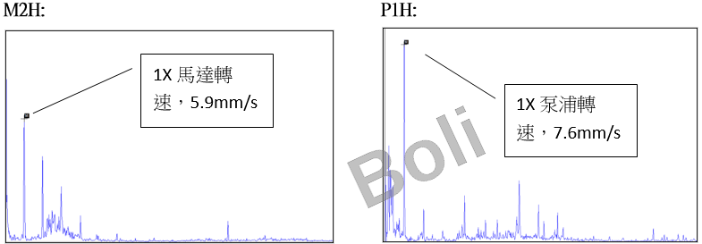 在馬達驅動側水平向振動值達8.2mm/sRMS,在泵浦水平向振動值達9.7mm/sRMS