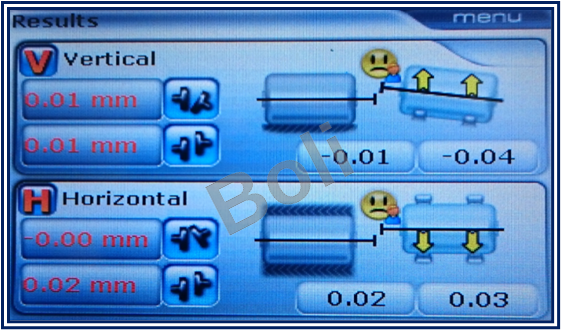 二、第一次量測: (已對心),對心結果: 垂直向(角度差:0.01,平行度:0.01mm);水平向(角度差:0.00,平行度:0.02mm)