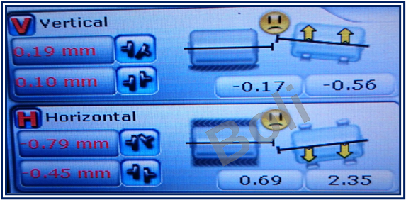 三、第二次量測: (不對心),對心結果: 垂直向(角度差:0.19,平行度:0.10mm);水平向(角度差:-0.79,平行度:-0.45mm)