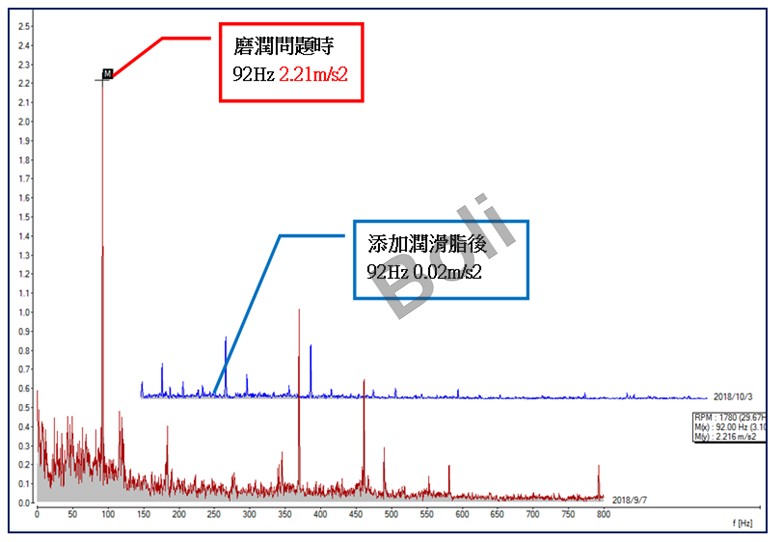 由上資料得知,使用包絡值及包絡頻譜量測風機及馬達,可有效檢出軸承潤滑問題,防止因軸承磨潤產生的問題,將有效降低軸承的損壞或馬達異常故障的情況發生。