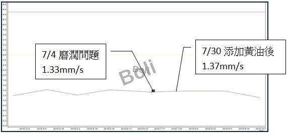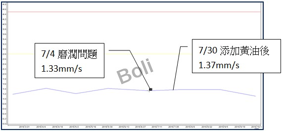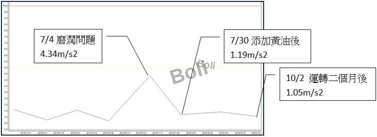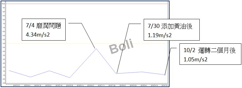 2. 精密「加速度包絡值」量測,7/4在馬達驅動側水平向為:4.34m/s2,添加黃油後在7/30數據為:1.19m/s2,恢復為正常值,之後一直到10/2加速度包絡值仍然在1.19m/s2值附近。