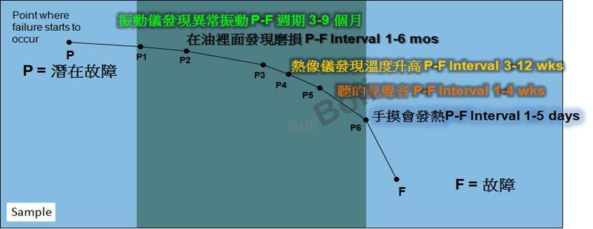 在設備可靠度中,最重要的一點是「如何訂定檢測週期」,下列圖表是一張潛在故障到完全故障的曲線圖,但如果您在潛在故障的初期發現問題,也許經過您的立即處理或調整,設備可以再度恢復正常狀況,或至少可以在數月前就發現問題,以提早準備備品及計劃停機更換。