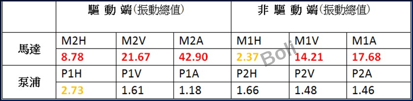 3600RPM離心泵在化工製程屬於重要設備,運轉8個月後,各點的振動值數據如下,造成聯軸器橡膠墊每3~5天更換一次。