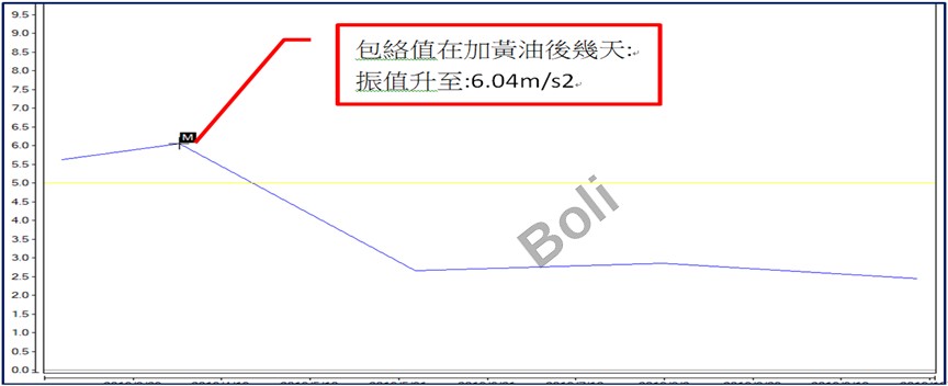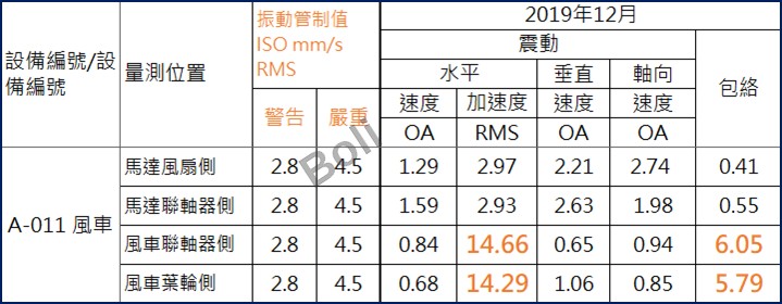 2. 風機各點速度振值均在振動值標準內,但在風車加速度與包絡值已明顯偏高,因此不斷發生風機軸承磨損問題。