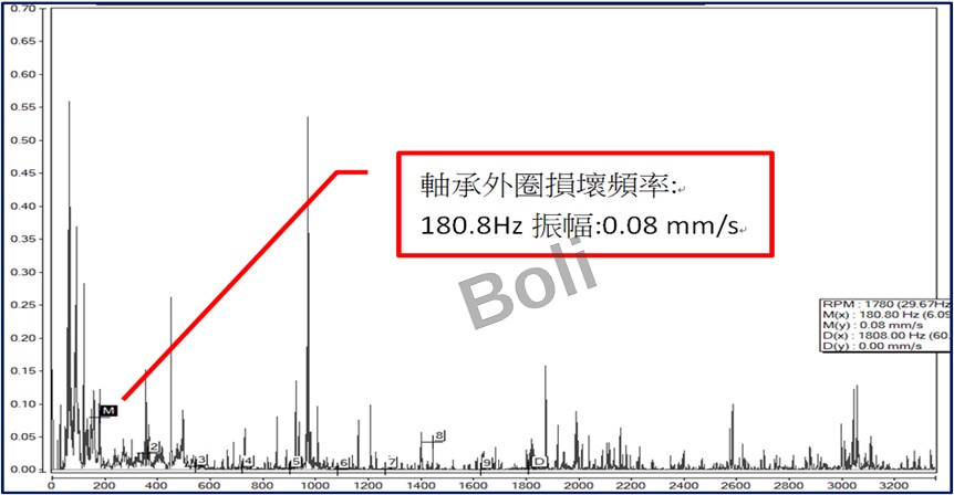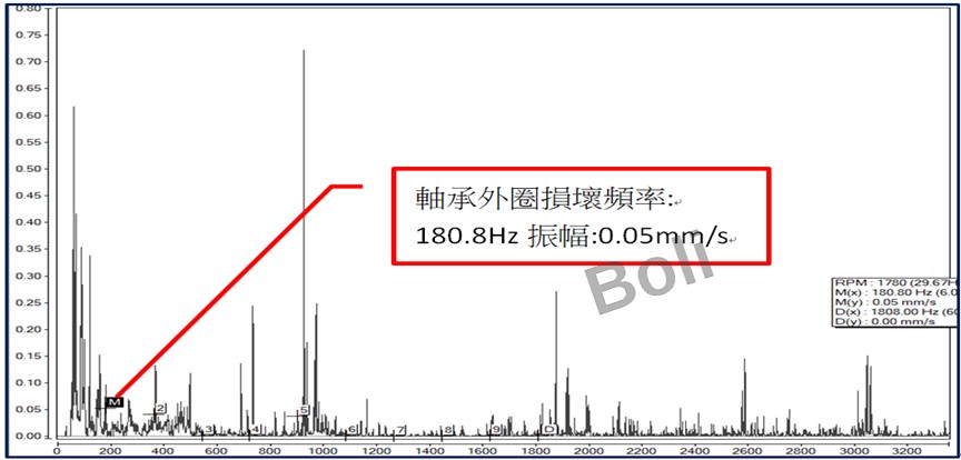 2. F2H有軸承外圈損壞頻率:180.8Hz振幅:0.08 mm/s