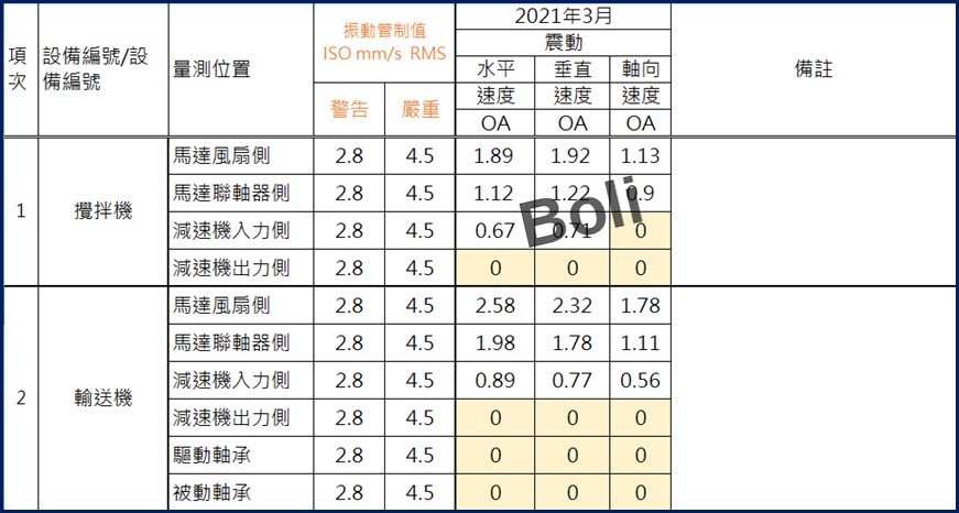 1.攪拌機轉速28RPM約0.47Hz,一般振動計最低振動值選擇為:(2~1,000Hz) ,因此無法量到攪拌機一倍頻0.47Hz的振幅,所以在上表橘色底有4個量測數據為 0mm/sRMS。