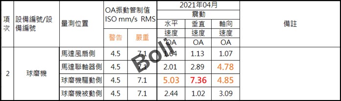 所以,工廠除了使用ISO-10816-3振動值標準的振動值超標設定,對特殊的故障頻率(如:軸承)與特別的設備(如: 球磨機),需要另外的設定及使用頻譜分析,如您對以上資料有問題,請您不吝通知或寄eMail詢問!