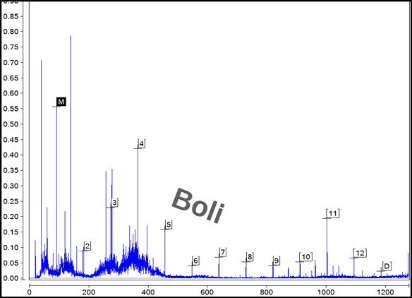 1.冷卻水泵轉速1,184RPM約19.73Hz,泵葉輪側軸承號碼:6218,在速度頻譜發現:89.85Hz諧波如第四項第2條之冷卻水泵頻譜,判斷: 泵葉輪側軸承已磨損嚴重;建議:請儘快安排更換軸承。