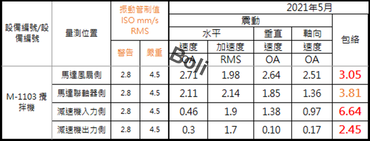 判斷: 減速機入力側軸承已磨損嚴重;建議:請儘快安排更換軸承。