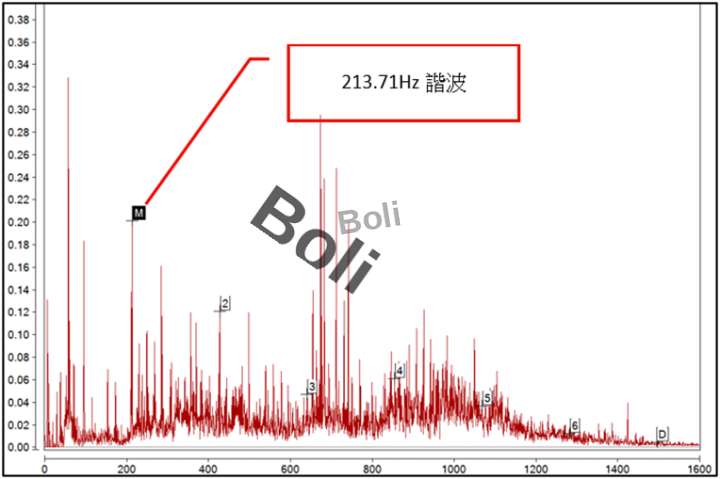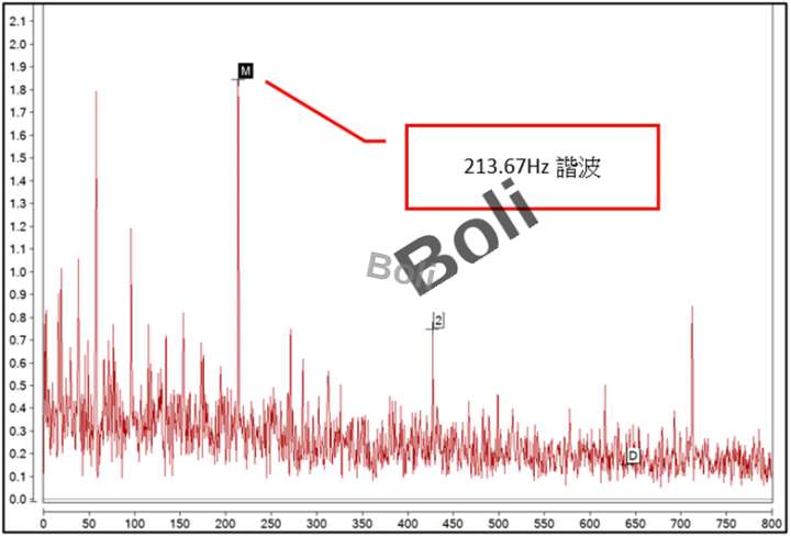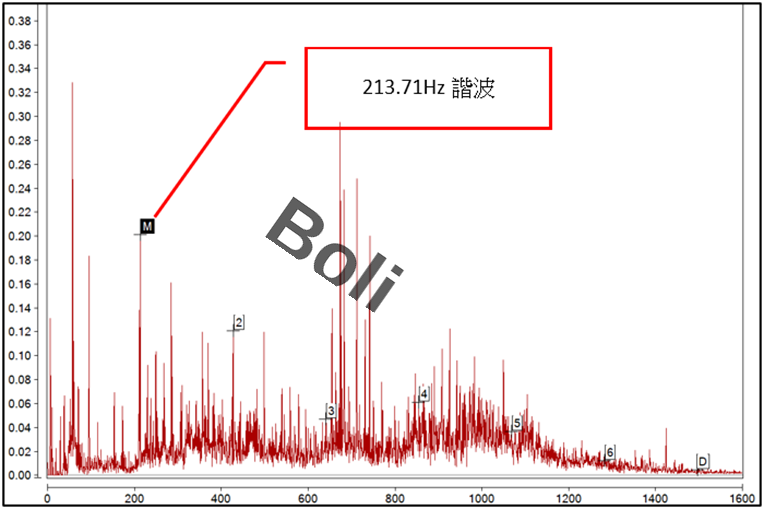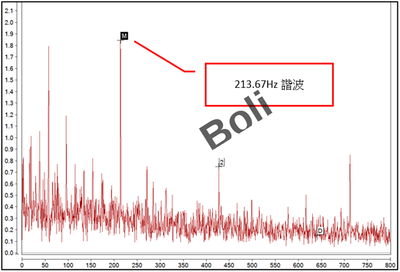 攪拌機馬達轉速1,745RPM約29.08Hz,減速機入力側--超高頻包絡頻譜發現:213.67Hz諧波如第四項第2條-1,再到第四項第2條-2高解析度頻譜分析發現:213.71Hz諧波。