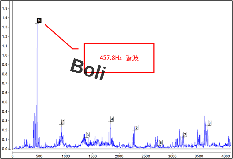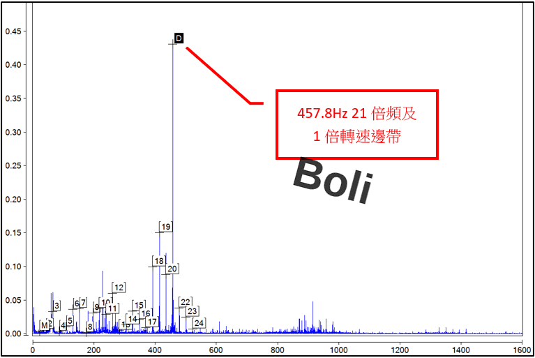 建議:設定高解析度頻譜及加速度頻譜,每月定期檢測,如在齒輪嚙合頻率發現1倍轉速邊帶振幅升高,請在每月定檢時做檢查並更換。