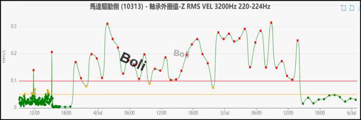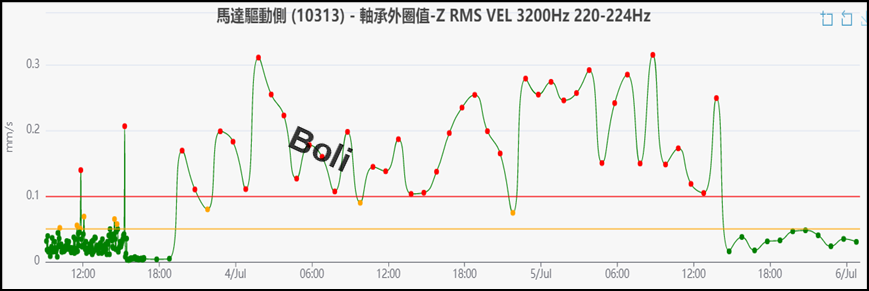 無線振動監測每小時量測一筆數據,在今年7/3加速度值持續升高,經添加黃油後振動值降至標準內