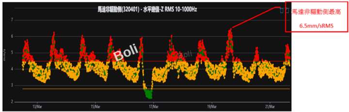 使用無線振動監測每小時量測一筆數據,在更換馬達後,在馬達非驅動與驅動側振動總值OA持續超過報警值2.8mm/sRMS及危險值4.5mm/sRMS
