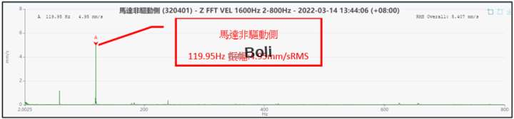 馬達一倍頻轉速:59.72Hz,如果是不對心問題應是二倍頻:119.44Hz,但在馬達二側的高解析頻譜是在頻率接近120Hz,振幅較高,判斷為馬達軟腳或馬達電氣問題。
