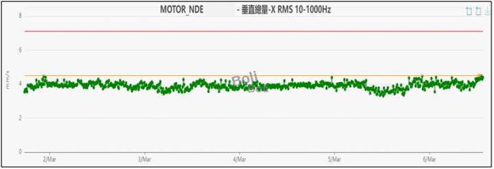 1.使用無線振動監測每10分鐘一採一筆數據,發現在馬達非驅動側垂直振動總值 OA範圍: 3.5~4.5RMS之間