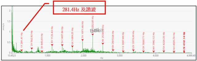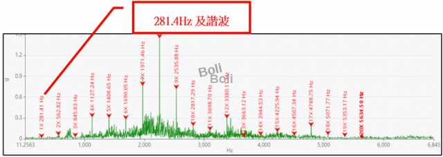 水平向,發現頻率:281.4Hz約10倍頻及諧波,為螺旋體磨損訊號
