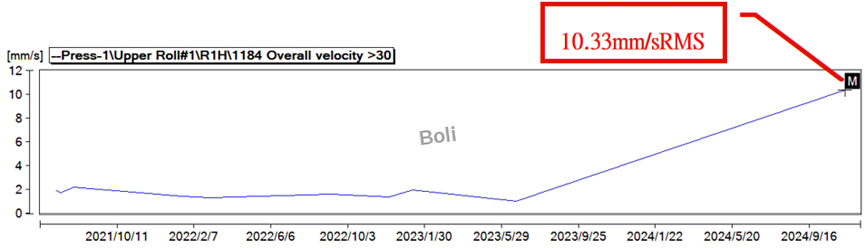 Press Roll非驅動側水平向,發現速度OA值由平均2mm/sRMS升至10.33mm/sRMS