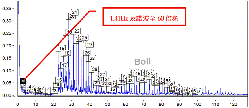 使用0.06Hz高解析頻譜在垂直向,發現頻率:1.41Hz及諧波至60倍頻,為軸承或軸心磨損訊號