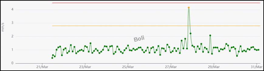 減速機出力側水平向,發現速度OA值由平均1mm/sRMS升至4.2mm/sRMS
