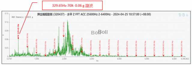 診斷結果: 該頻率的 3 倍頻振幅及諧波被判斷為軸心shaft磨損訊號