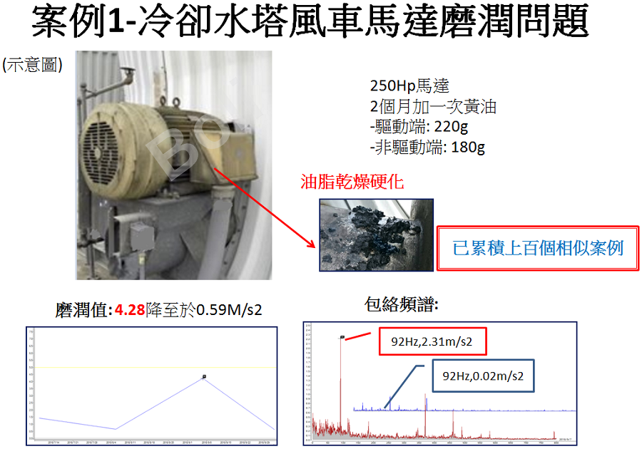 此案例,馬達添加新滑油脂後,舊油脂掉落呈現硬黑顆粒狀,磨潤值由 4.28 降至 0.59M/s2,包絡頻譜在 92Hz 振幅由 2.31 降至 0.02M/s2!