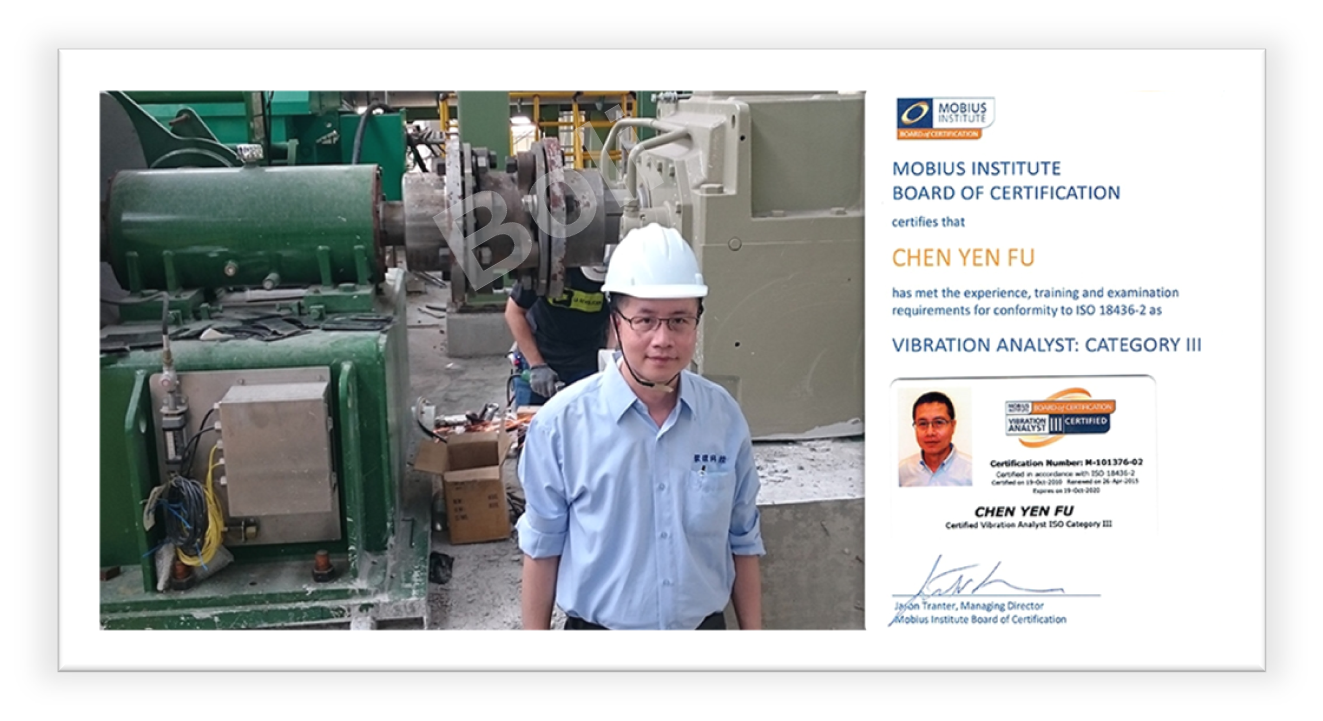 本公司擁有優秀的經營團隊及訓練有素、學有專精的工程師,主要振動檢測分析師陳彥夫先生擁有近30年現場振動診斷與培訓經驗: