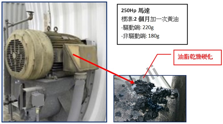 冷卻水塔風車馬達軸承磨潤問題,"潤滑脂乾燥"、"硬化"及"油量不足"。