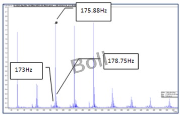 1.在速度頻譜在一倍諧波上,已出現馬達滑差頻率旁波。