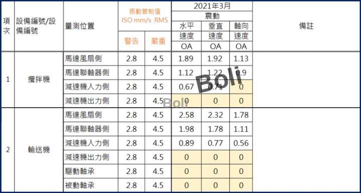 1.攪拌機轉速28RPM約0.47Hz,一般振動計最低振動值選擇為:(2~1,000Hz) ,因此無法量到攪拌機一倍頻0.47Hz的振幅,所以在上表橘色底有4個量測數據為 0mm/sRMS。