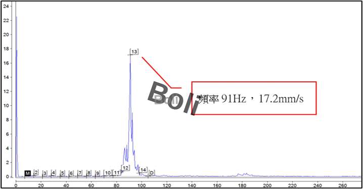 (3). 2P 下轆減速機垂直—速度頻譜分析: 滾轆一倍轉速7Hz,91Hz為13倍頻