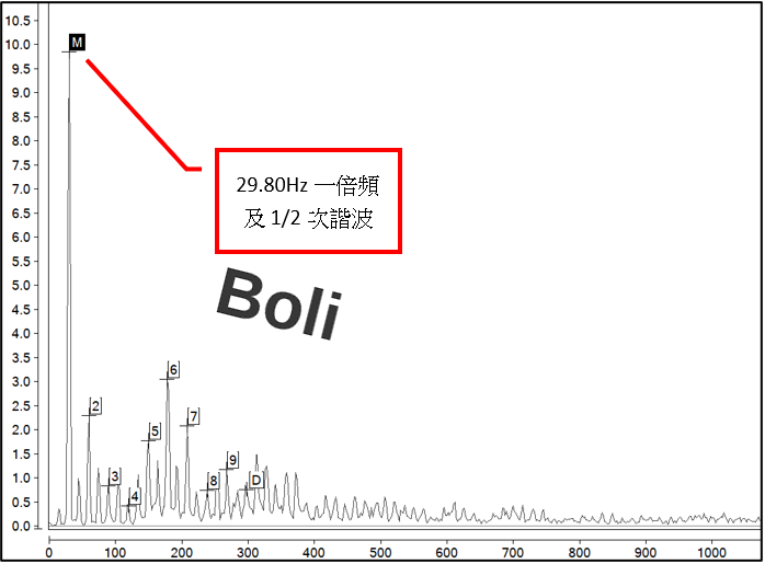 建議:設定高解析度頻譜及加速度頻譜,每月定期檢測,如在風機二側軸承發現1倍轉速及1/2倍頻振幅升高,請在每月定檢時做檢查並更換。