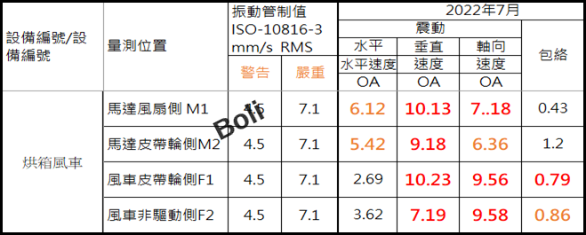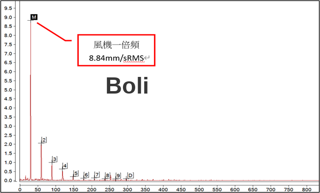 建議:每月定期檢測,如垂直向振動較水平高出許多及主要頻率在1倍轉速及諧波,請檢查各軸承座螺絲或風機基礎螺絲是否有鬆動,並緊固各個螺絲。