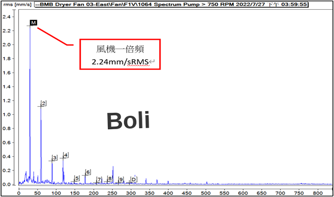 2. 塗佈區風機1倍頻振動,可能有軸承座螺絲或風機基礎螺絲鬆動、葉片不平衡等等原因。