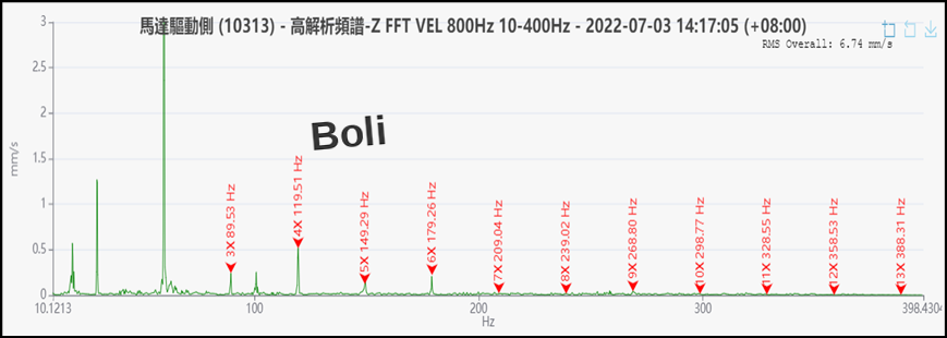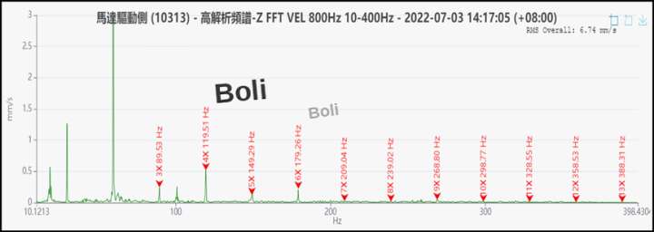 在7/3未添加黃油,高解析頻譜在100.82Hz(約3.37X)為軸承外圈特徵頻率