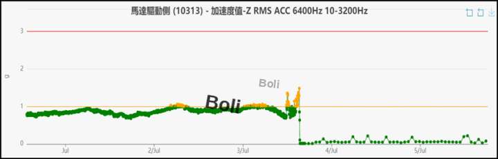 無線振動監測每小時量測一筆數據,在今年7/3加速度值持續升高,經添加黃油後振動值降至標準內