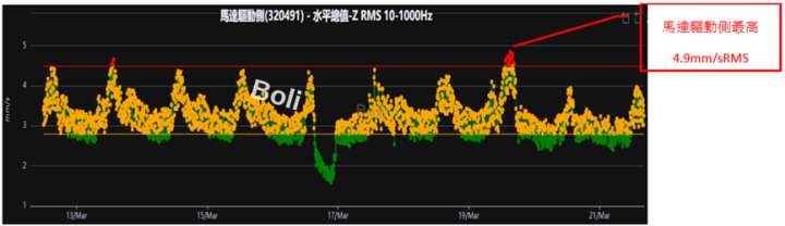 使用無線振動監測每小時量測一筆數據,在更換馬達後,在馬達非驅動與驅動側振動總值OA持續超過報警值2.8mm/sRMS及危險值4.5mm/sRMS