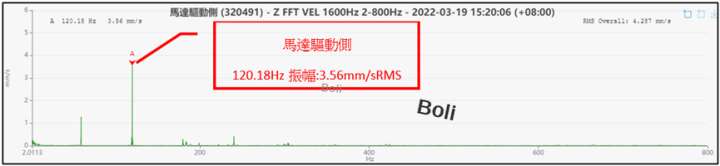 由高解析頻譜發現馬達二側軸承有明顯二倍電工線頻,主要振幅頻率約:120Hz,判斷為馬達軟腳或馬達電氣問題。