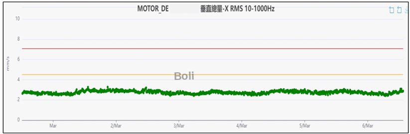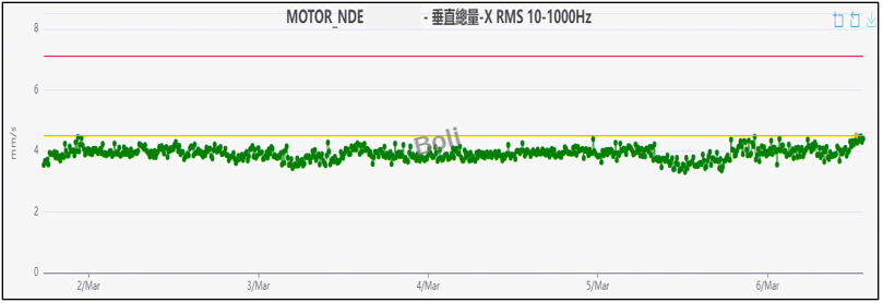 1.使用無線振動監測每10分鐘一採一筆數據,發現在馬達非驅動側垂直振動總值 OA範圍: 3.5~4.5RMS之間