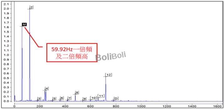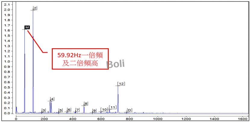 馬達一倍頻轉速:59.92Hz及二倍頻振幅較高,需使用「相位做進階診斷」!