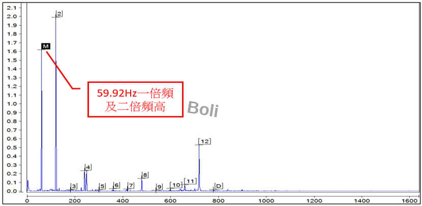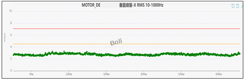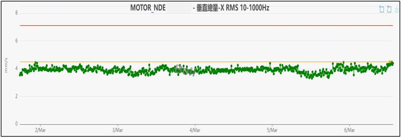 1.由以上所設定的二項報警,發現馬達驅動端軸承磨損,將可即時檢出異常振動問題,達到預知檢測PDM目的。