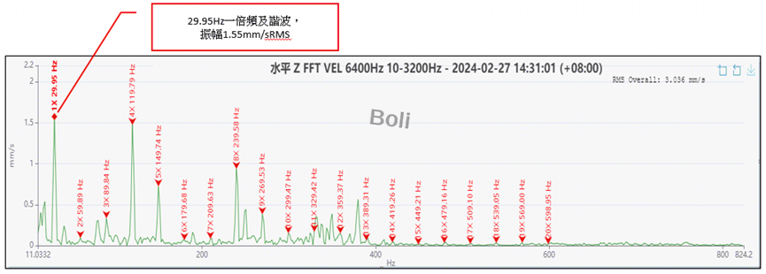 水平向,發現頻率:29.95Hz一倍頻及諧波,為軸承鬆動或軸承座內孔磨損訊號