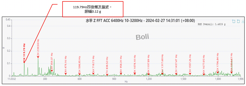 水平向,發現頻率:119.79Hz四倍頻及諧波,為軸承座內孔磨損訊號