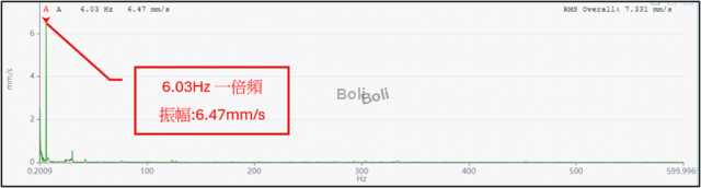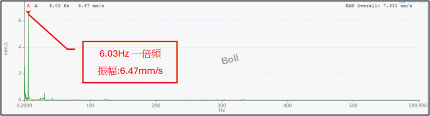使用0.1Hz高解析頻譜在水平向,發現頻率:6.03Hz一倍頻振幅高,為葉片不平衡訊號