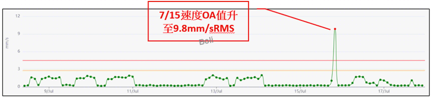 馬達驅動側水平向,發現7/15速度OA值在更換馬達後振動值升至9.8mm/sRMS