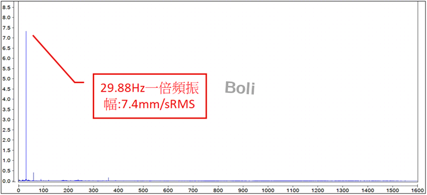 使用0.1Hz高解析頻譜在水平向,發現頻率:29.8Hz一倍頻振幅高,為馬達或聯軸器不平衡訊號