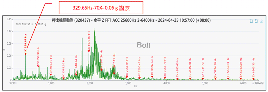 診斷結果: 該頻率的 70 倍頻振幅及諧波被判斷為軸承磨損或齒輪初期磨損訊號